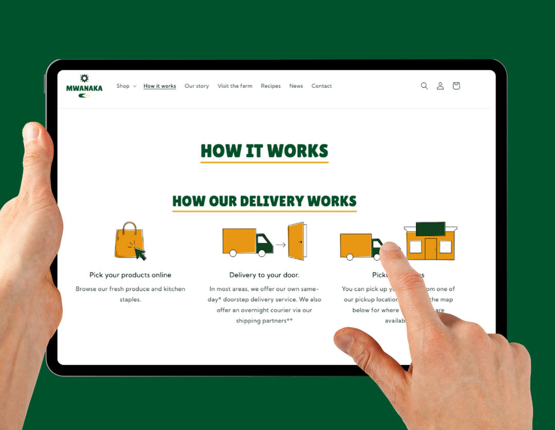We partnered with Mwanaka to deliver a bold new brand identity, complete with brand guidelines to ensure consistent visual storytelling across all touchpoints. A fresh Shopify website was designed and built with e-commerce functionality at its core, including complex delivery rules to handle variable shipping, local delivery, and pick-up points. This simplified back-office operations while offering customers flexible options at checkout.